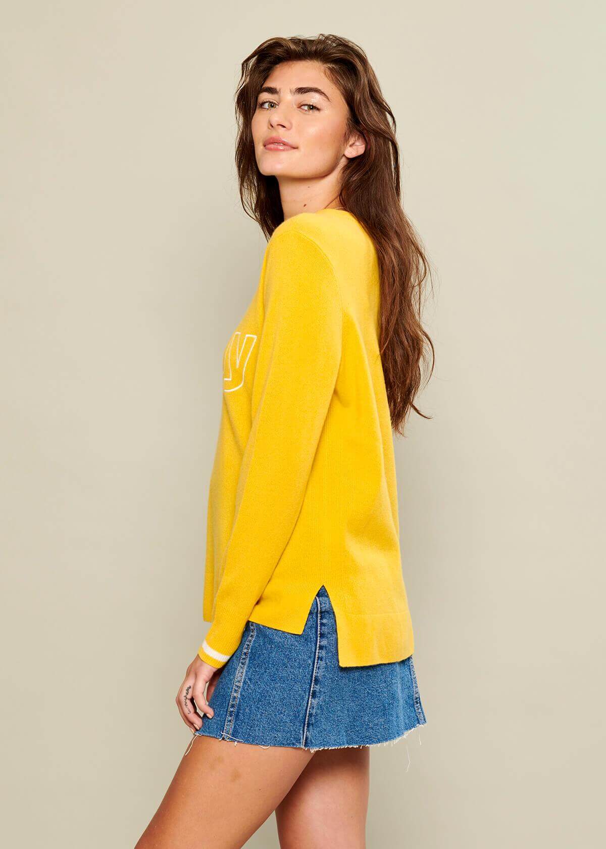 Strike the perfect balance between style and comfort in the Sophie Sweater. Brighten your look with our bright yellow cashmere sweater featuring a playfully printed “Happy” across the front. With designer details and premium quality, you can look put-together while feeling totally relaxed. Celebrate life with this adorable designer sweatshirt from South Parade.